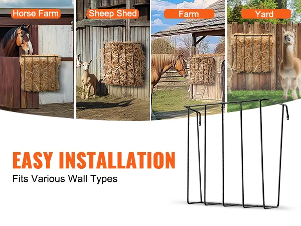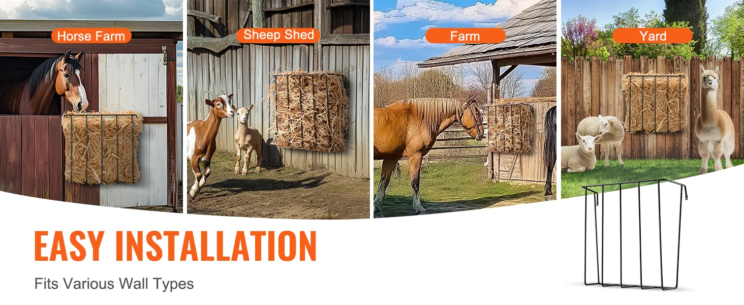 Deze hooiruif is ideaal voor montage op verschillende muren in paardenboerderijen, schapenboerderijen, boerderijen of privéerven. Of het nu om een houten muur, een bakstenen muur of andere materialen gaat, hij kan eenvoudig worden bevestigd.