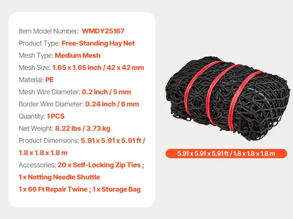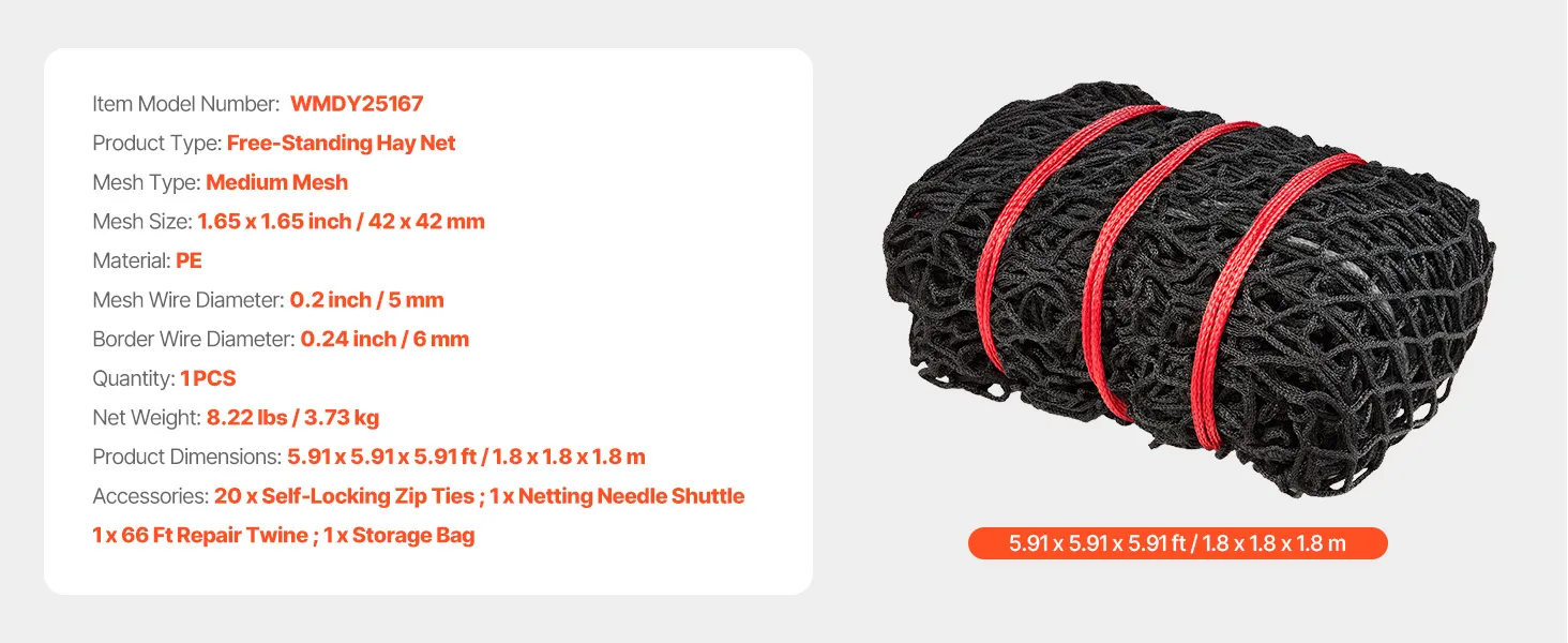 Grote capaciteit: Met afmetingen van 1,8 x 1,8 x 1,8 m (5,91 x 5,91 x 5,91 ft) biedt dit ronde hooinet ruimte aan 816–1000 kg (1800–2200 lbs) hooi, inclusief balen alfalfa en timotheegras. De grote opening maakt vullen eenvoudig en verstelbare banden zorgen ervoor dat het voer stevig vastzit, waardoor efficiënt voeren van de dieren gegarandeerd is.