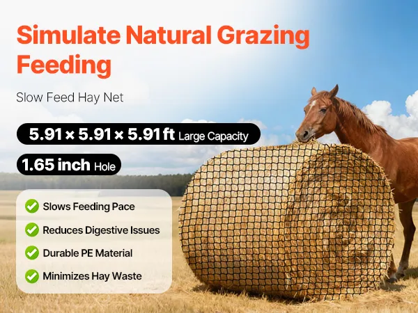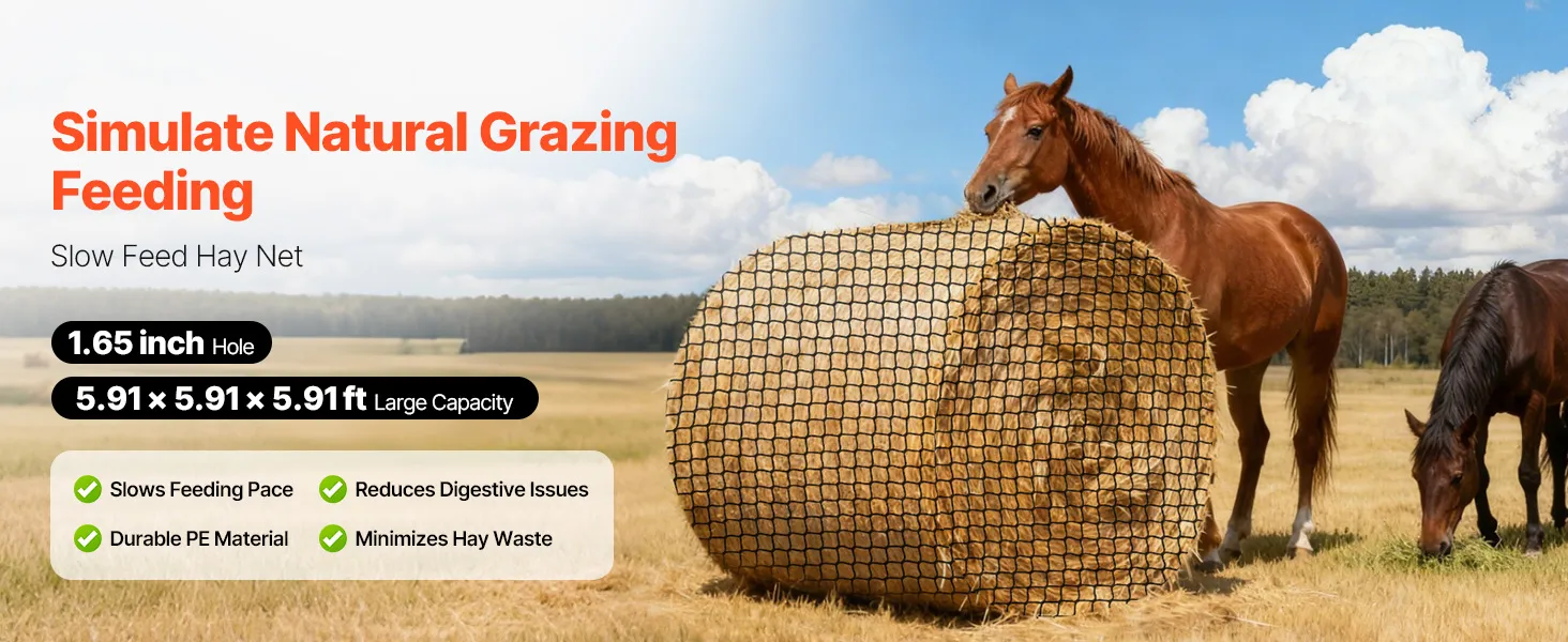 Knooploos en veilig: Dit hooinet voor ronde balen is ontworpen zonder knopen om slijtage aan de tanden te verminderen en zo de gebitsgezondheid te bevorderen. Het zorgt voor veilig en comfortabel voeren, minimaliseert het risico op verwondingen en stelt paarden in staat om op een natuurlijke manier te eten zonder verstrikt te raken.