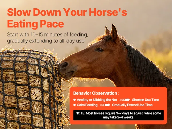 Ons ronde hooinet met slow feeding-functie maakt rustig voeren mogelijk, waardoor paarden positieve eetgewoonten ontwikkelen en angst en weerstand verminderen. Het voorkomt stereotiep gedrag en ondersteunt de spijsvertering voor efficiënt voeren op de lange termijn.