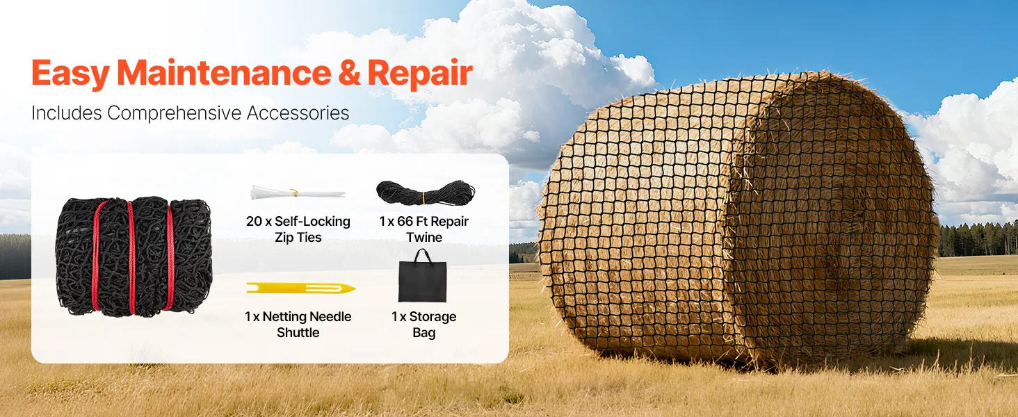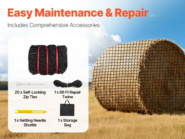 Dit hooibalennet maakt snelle reparaties en gedeeltelijke vervangingen mogelijk met behulp van de meegeleverde reparatieaccessoires. Het vereenvoudigt het onderhoud, verlengt de levensduur en verlaagt de vervangingskosten voor langdurig en kosteneffectief gebruik.