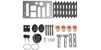 De schuifhekaandrijving heeft een draadloos toetsenbord, infraroodsensor en handmatige ontgrendelingsknoppen om de veiligheid te garanderen. De motor is voorzien van een temperatuurbeveiliging om overbelasting van de motor te voorkomen.