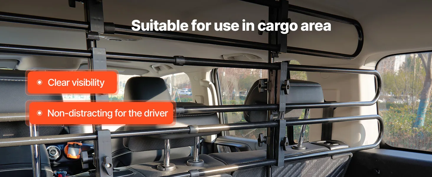 Our dog car barrier keeps your dog from climbing into the driver's seat and distracting you. It fits a variety of vehicle models, is easy to install, and won’t block your view, ensuring a smooth and secure journey for both you and your pet.
