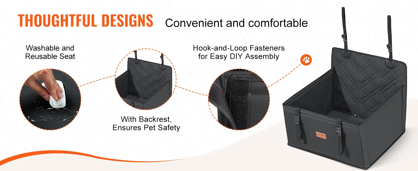Comfortabel en praktisch ontwerp: het puppy-autostoeltje met hoge rugleuning biedt extra veiligheid tijdens plotselinge stops en beschermt uw lederen stoelen. Klittenbanden maken individuele installatie mogelijk. De stoelhoes is gemakkelijk schoon te maken en te onderhouden.
