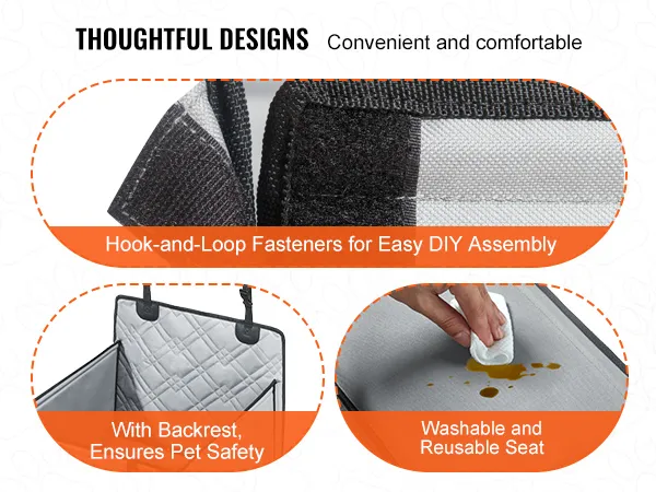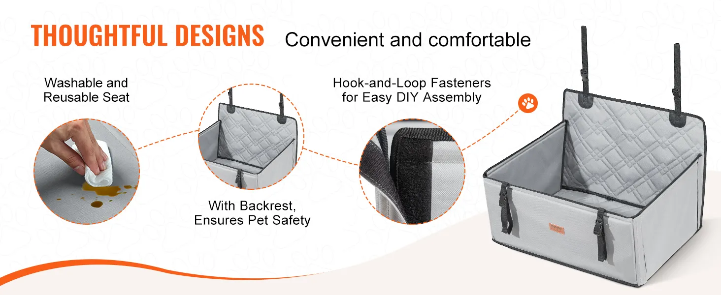 Convenient & Practical Design: The puppy car seat with a high back design provides additional safety during sudden stops and protects your leather seats. Velcro strips allow for customizable assembly. The seat cover is easy to clean and maintain.