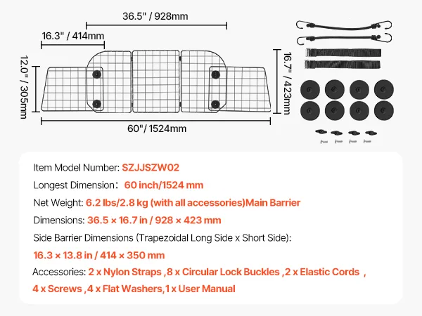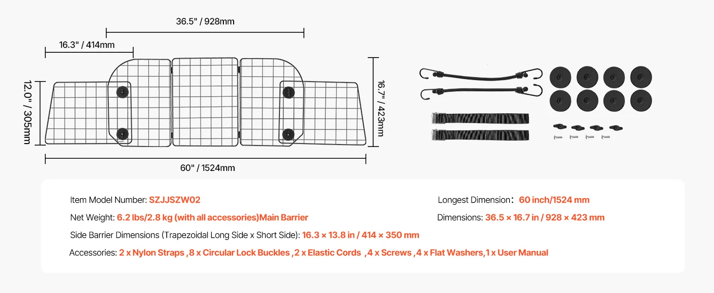 Universal Fit & Adjustability: The main panel of our dog car barrier measures 36.5 x 16.7 inches (928 x 423 mm), with side panels measuring 16.3 x 13.8 inches (414 x 350 mm), extending up to 60 inches (1524 mm). It can be customized with various configurations to fit different vehicle models, including SUVs, vans, jeeps, and hatchbacks (rear headrest only).