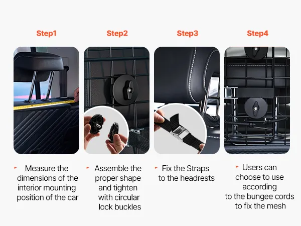 This dog car barrier is simple to set up with no drilling required. Secure it to the rear seat headrests using circular locks and nylon straps. An additional elastic cord is included for extra stability, ensuring the barrier stays firmly in place.