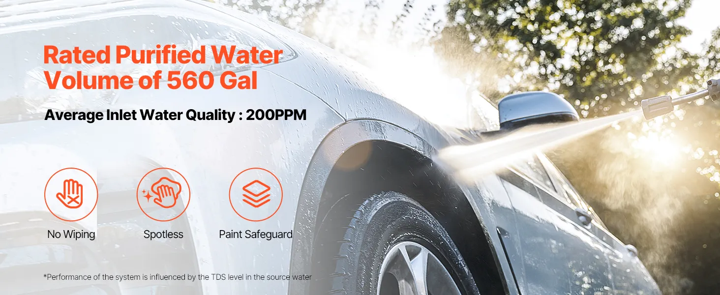 The car washing system operates efficiently with stable water output, providing a rated water capacity of 560 gallons. It delivers pure deionized water for a spotless, streak-free car wash experience, minimizing the need for wiping while also guarding the car's paint.