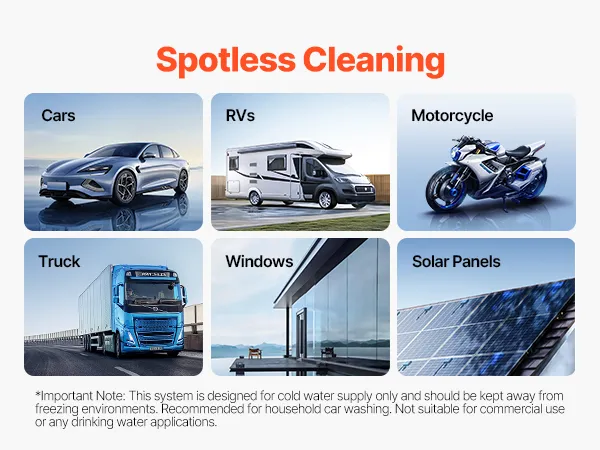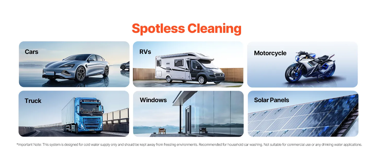The car washing system is mainly used for everyday home cleaning of cars and RVs, but it can also be used to clean boats, motorcycles, windows, solar panels, etc., achieving a shiny surface out of water scale buildup.