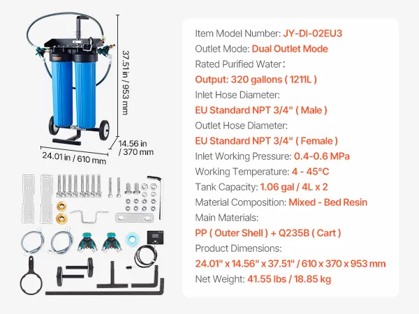 320gal Water Purification: With a 200ppm average water quality, this deionized water system offers a theoretical purification capacity of 320 gallons, delivering high performance without frequent filter replacements, ensuring continuous delivery of pristine deionized water.