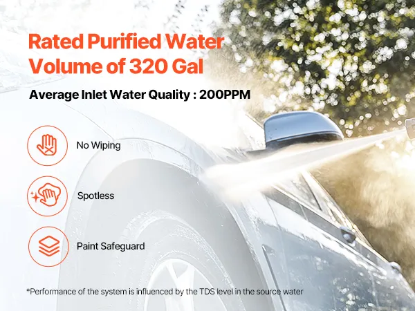 The car washing system operates efficiently with stable water output, providing a rated water capacity of 320 gallons. It delivers pure deionized water for a spotless, streak-free car wash experience, minimizing the need for wiping while also guarding the car's paint.