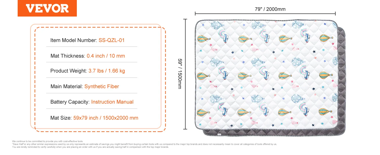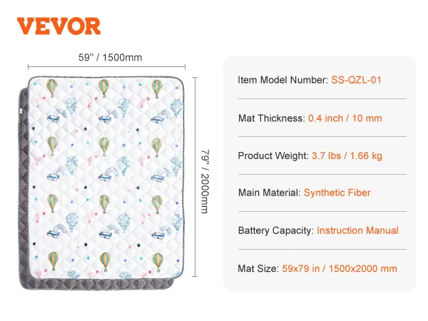 Soft and Comfortable: The large 59x79 inch / 1.5x2 m baby play mat provides a comfortable activity area for your baby. The breathable and fine surface fabric, along with the thick polyester fiber cotton filling, effectively insulates against cold or damp floors at home.