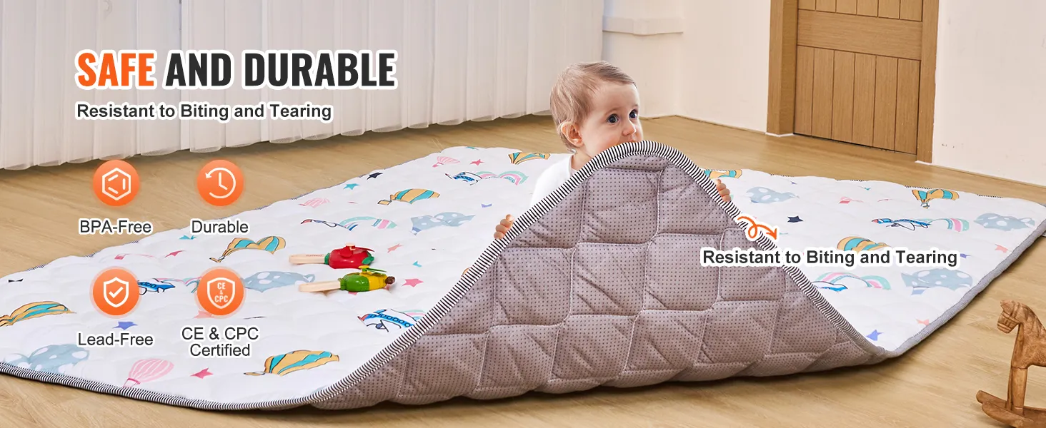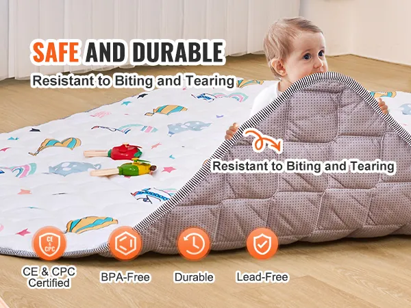 Durable & Long Lasting: The floor mat mat uses safe materials both inside and out. It meets CPC and CE certifications and passes ASTM and EN71-1/2/3 tests, ensuring it is safe even if your baby chews on it. The material is also wear-resistant and durable, not easily scratched or damaged by your baby.