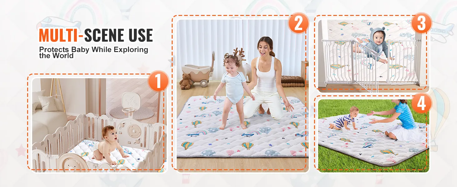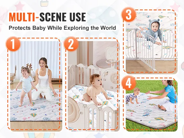 The activity playmat can also be used as a tent mat, fence mat, or outdoor play mat. It provides a convenient and comfortable space for your baby to play, crawl, sit, roll, curl up, lie down, take first steps, and sleep, offering endless fun and comfort.