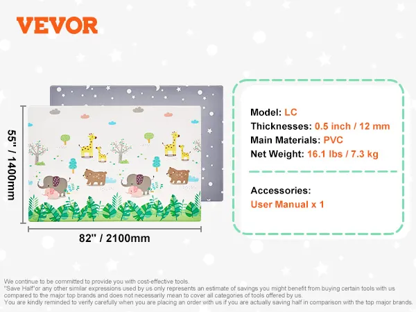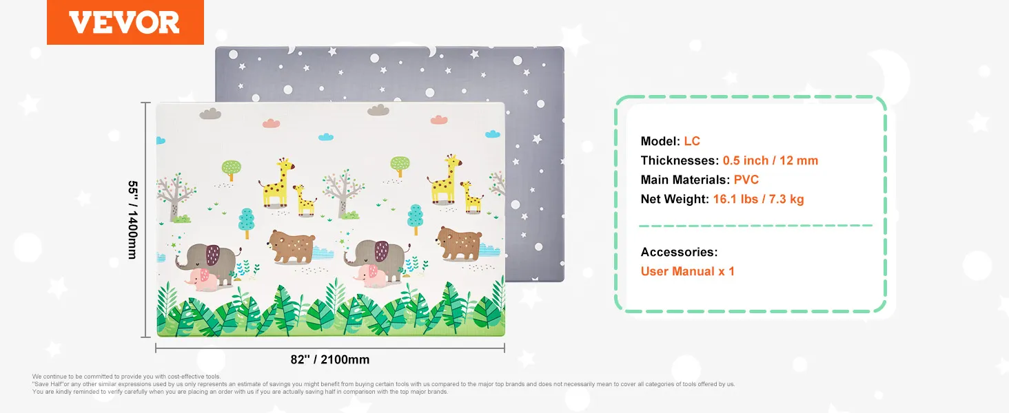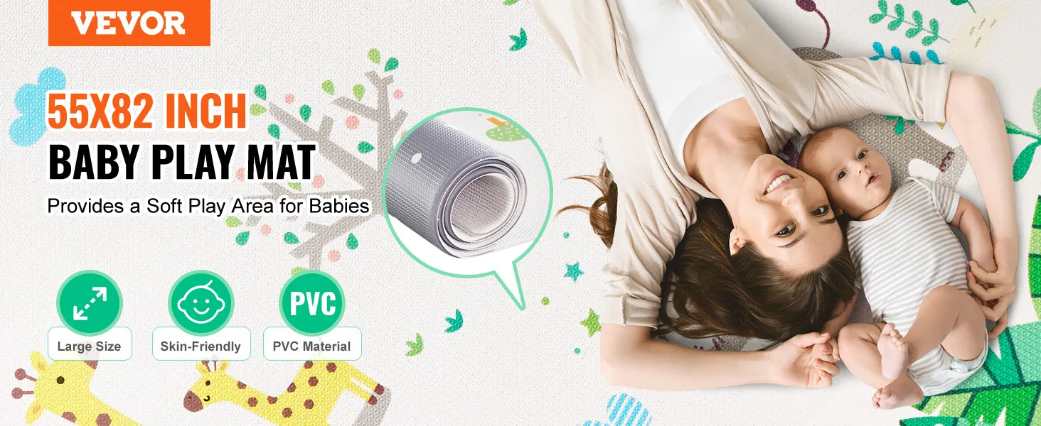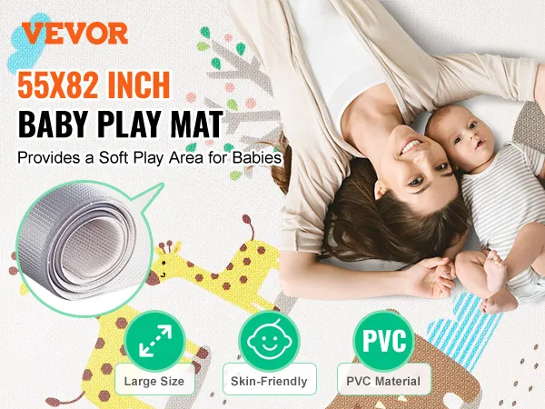 Spacious Activity Area: The large 55x82 inch / 2.1x1.4 m baby play mat provides a dedicated play space for your baby's activities. Made from PVC material, it is soft, creating a barrier between your baby and the cold, hard floor. It can be easily rolled up for storage. Your baby can enjoy tummy time, crawling, learning to walk, playing, and sleeping, whether indoors or outdoors.