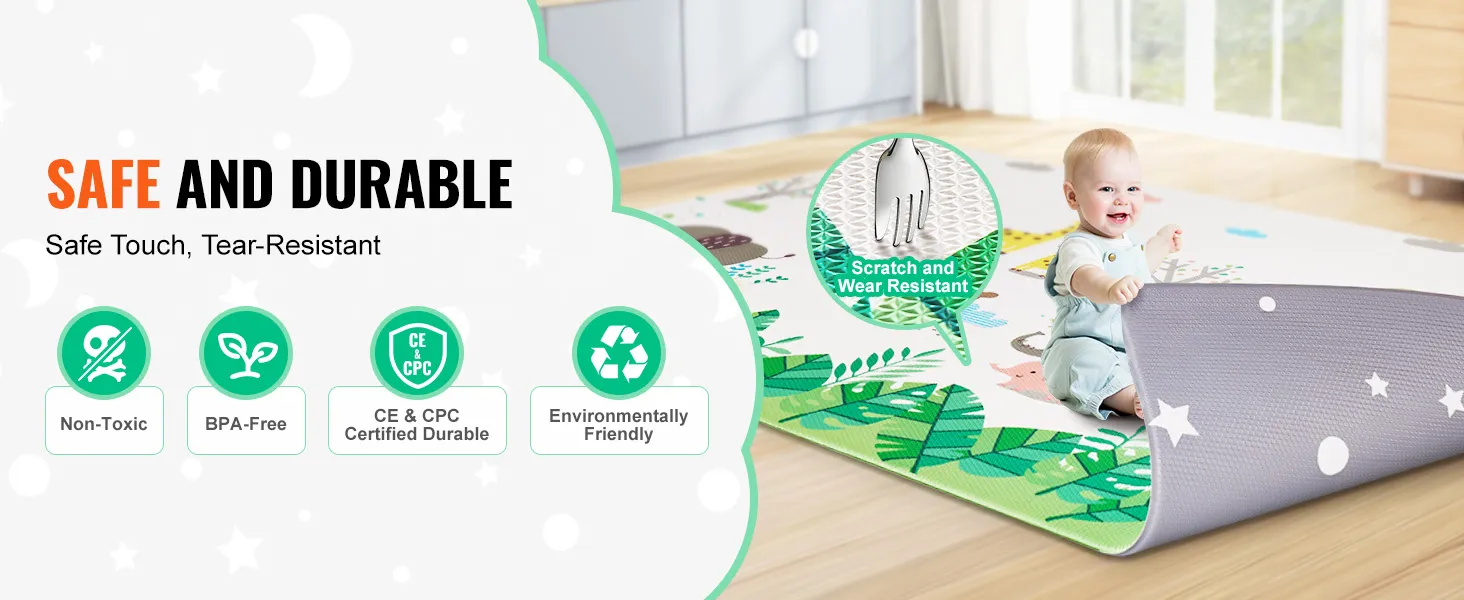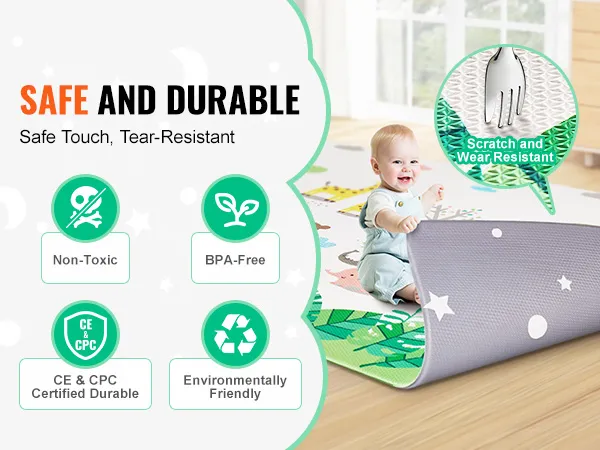 Durable & Long Lasting: We prioritize your baby's health and safety. The material is safe for direct contact. Our baby crawling mat meets CPC and CE certifications and passes ASTM and EN71-1/2/3 tests, ensuring your child's growth and protection. The surface is resistant to scratches and tears, even if your baby bites it. Toys and building blocks can be safely placed on the mat, extending its lifespan.