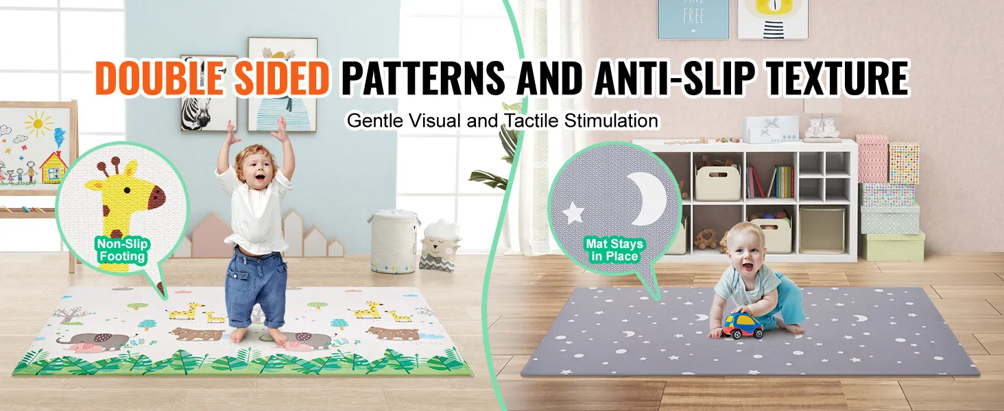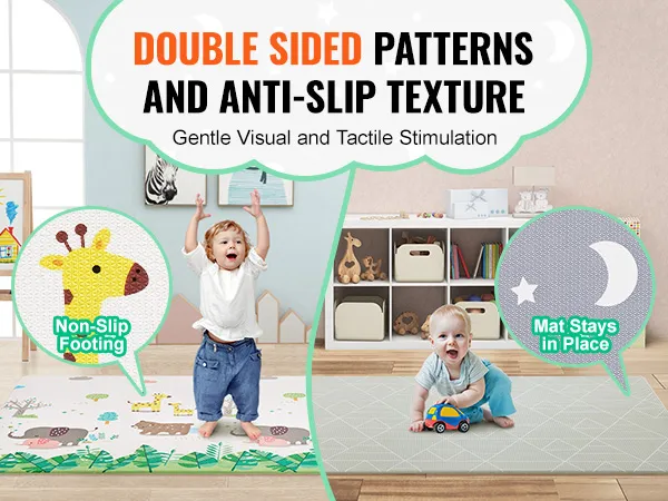 Both sides feature adorable designs that match your home decor, with dual-sided non-slip textures to prevent falls and help your baby safely learn to crawl and walk.