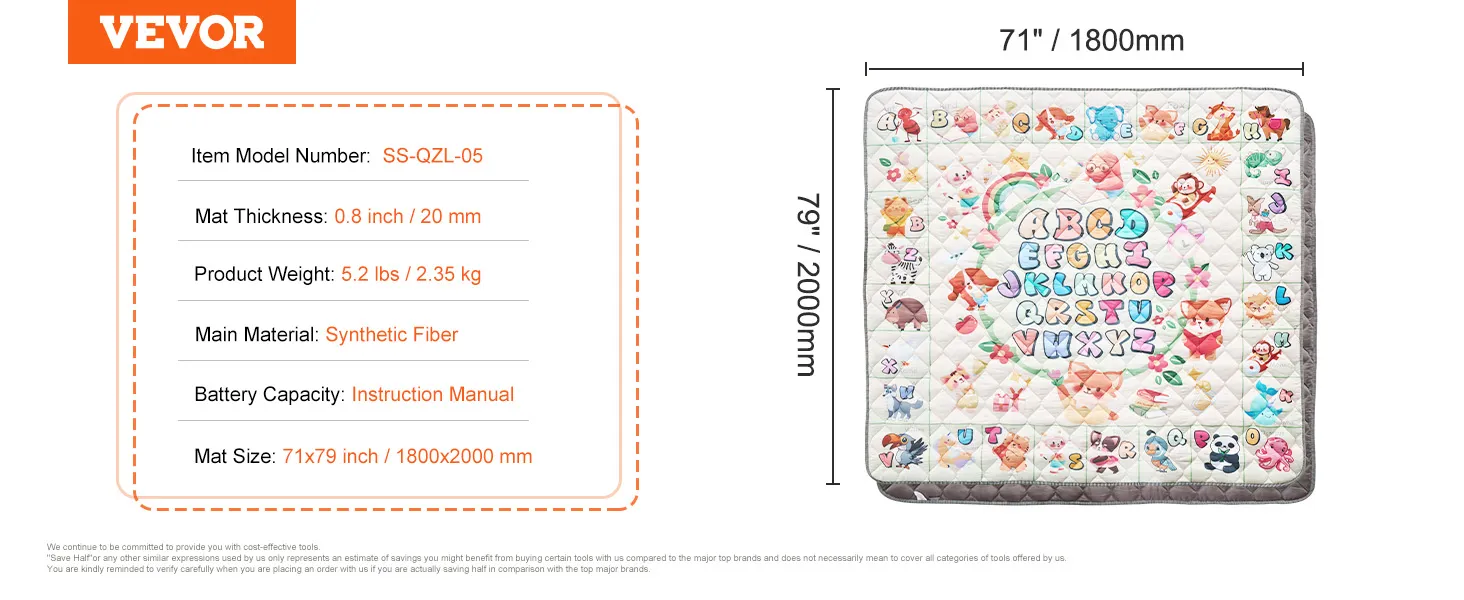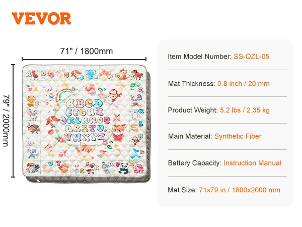 Soft and Comfortable: The large 71x79 inch / 1.8x2 m baby play mat provides a comfortable activity area for your baby. With a thickness of 0.8 inch / 20 mm, the breathable and fine surface fabric, along with the thick polyester fiber cotton filling, effectively insulates against cold or damp floors at home. The mat features animal and alphabet patterns in rich, soft colors, offering educational value.