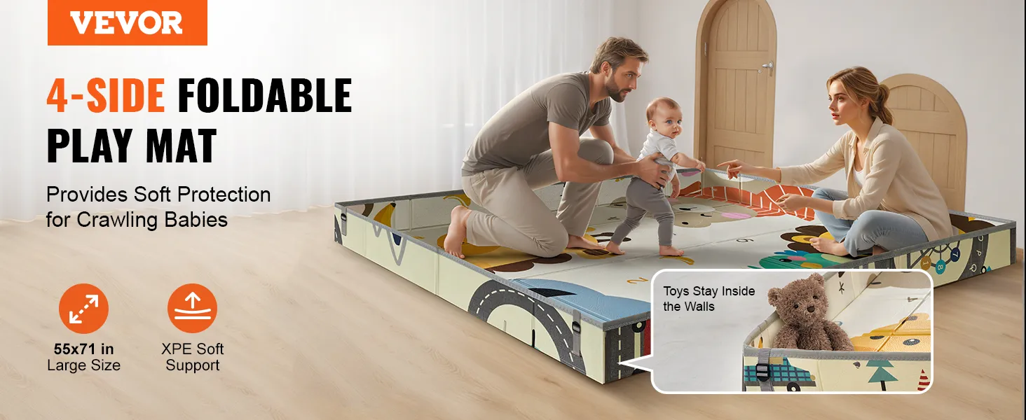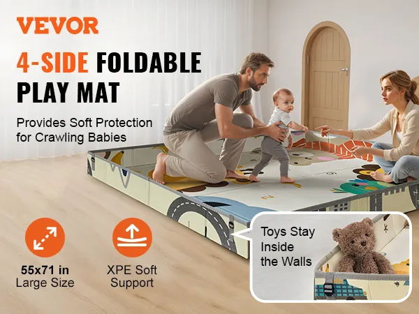 4-Sided Folding Walls: This large 55x71 inch / 1.4x1.8 m baby play mat can fold inward on all four sides to create walls, preventing balls and small toys from scattering around the house, and designating a safe play area for your baby. Made of thick XPE foam material, it provides soft support for various activities including tummy time, crawling, learning to walk, playing, and sleeping.