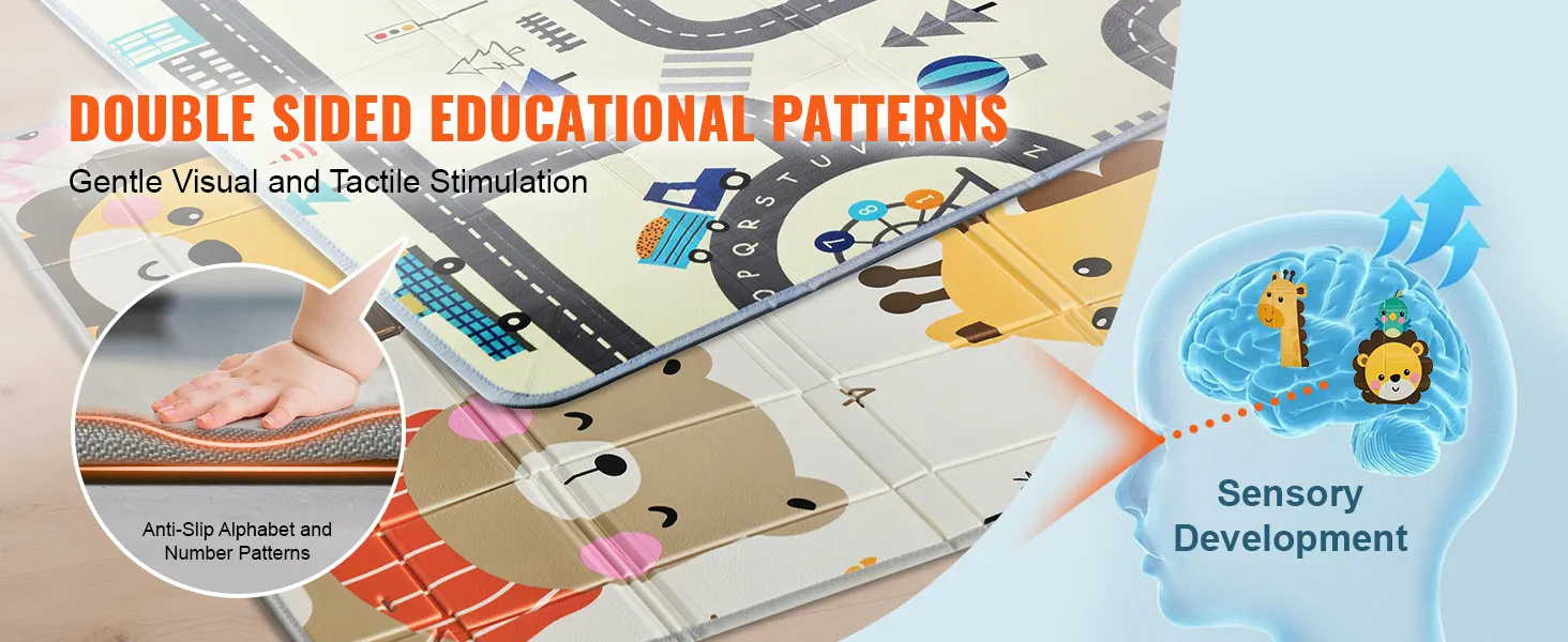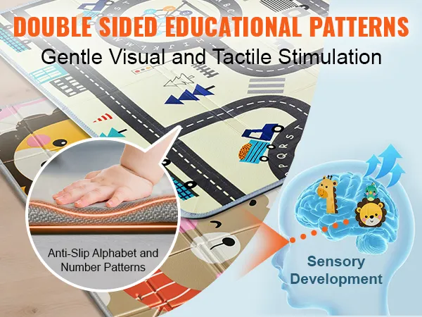 Dual-Sided Educational Design: The waterproof activity playmats is reversible, with different cute patterns on each side, including animals, simple mazes, and raised letters and numbers. These designs not only provide gentle visual and tactile stimulation but also have educational value, helping to develop your baby's cognitive and sensory skills. The raised patterns also offer some anti-slip benefits.