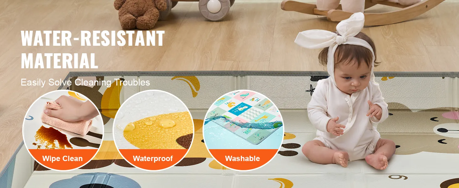 The anti-slip crawling mat activity playmats has a waterproof surface that can be easily wiped clean with a damp cloth or washed directly.