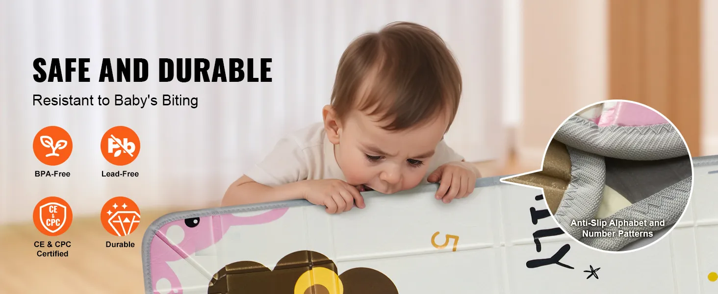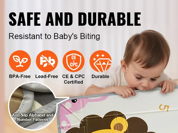 Durable & Long Lasting: We prioritize your baby's health and safety. The material is safe for direct contact, meeting CPC and CE certifications, and passing ASTM and EN71-1/2/3 tests, ensuring your child's growth and protection. The edges are covered with non-woven fabric to prevent the floor mat's film from being torn by your baby's chewing, extending its lifespan. The surface can be punctured by sharp objects, so avoid placing toys, pens, or items with sharp edges on the mat.
