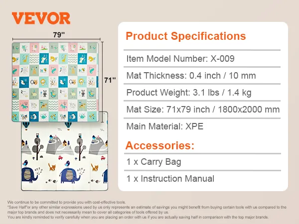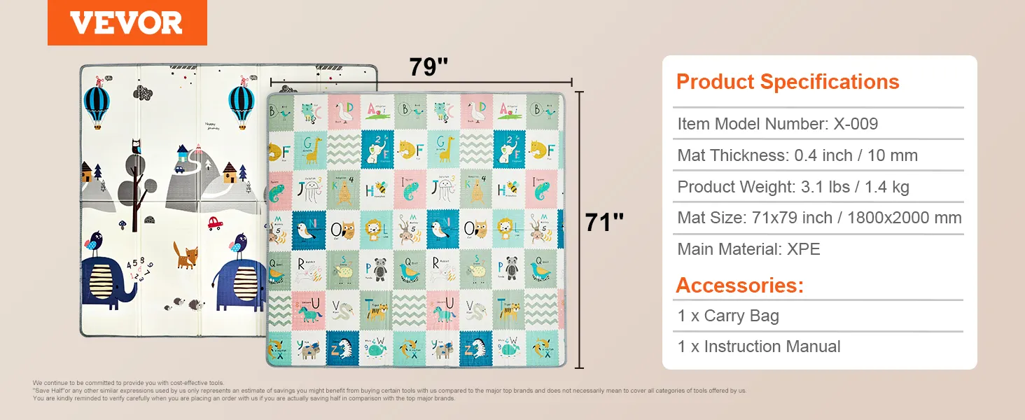 VEVOR Baby Play Mat, 71""x79"" Extra Large Baby Crawling Mat, Non-Slip One-Piece Foam Baby Playmat, Foldable Reversible Floor Mat with Travel Bag, Waterproof Activity Playmat for Babies Toddlers Infants