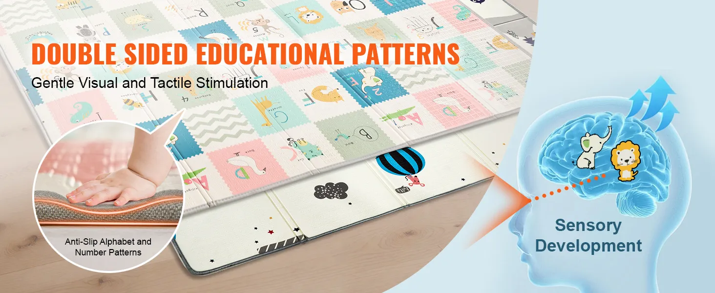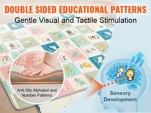Dual-Sided Educational Design: The non-slip cushioned baby playmat is reversible, with different cute patterns on each side, featuring animals, raised letters, and numbers. These designs provide gentle visual and tactile stimulation, giving your baby the opportunity to explore and learn, stimulating their imagination and offering an engaging play area. The raised patterns also provide some anti-slip benefits.