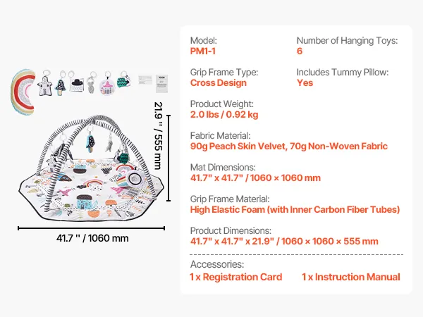 Growing with Your Baby: Designed for babies aged 0-18 months, the VEVOR multi-functional baby play gym mat offers a comfortable space for rest, play, and learning. With 6 interactive toys, it promotes baby's sensory development and motor skills, helping babies practice crawling, sitting, grasping, and more.