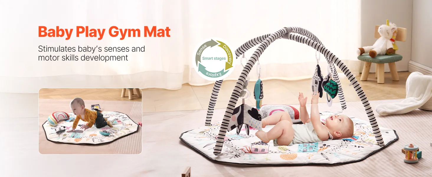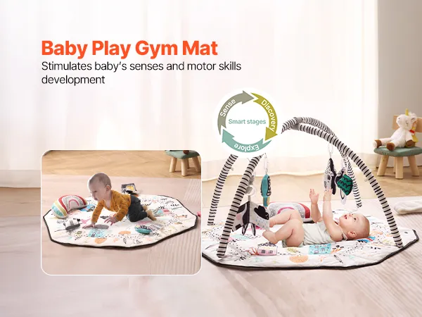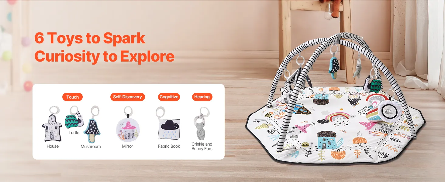Our baby play gym mat is essential for developing baby's sensory and motor skills. 41.7" x 41.7" large play mat comes with 6 sensory toys - ideal for babies in the cognitive stage. It helps them sense, discover, and explore the world, enhancing cognitive skills and fostering growth.