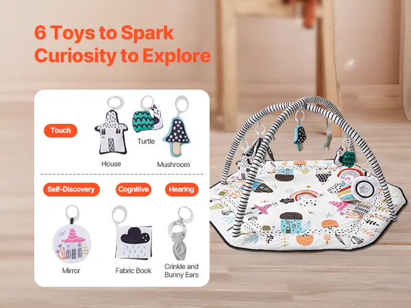 6 Sensory Toys: This tummy time mat comes with 6 removable hanging toys that stimulate baby's overall sensory development and hand-eye coordination. The turtle, house, and mushroom enhance tactile exploration, self-discovery mirror promotes visual ability, rattle toy improves auditory skills, and the cloth book fosters cognitive development.