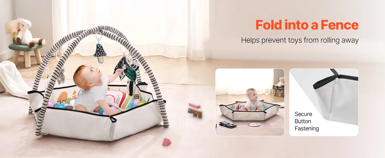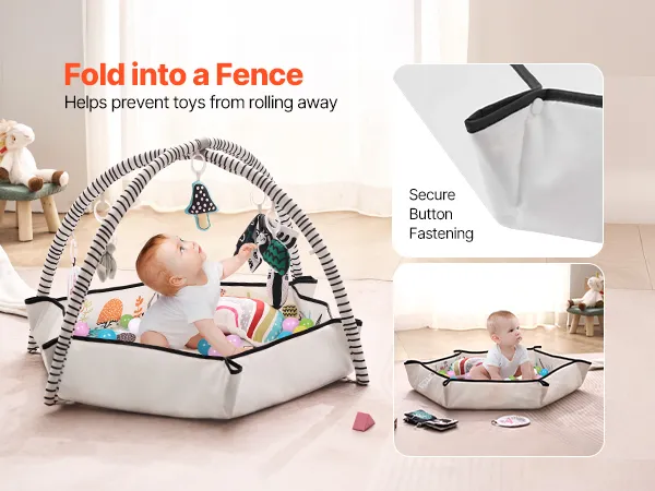 Foldable Surround: This infant play mat and activity gym features fold-up sides that can create a safety fence, preventing small toys like balls from scattering around the house. The button fastener design ensures a secure connection, providing easy and quick setup while keeping your baby safe.