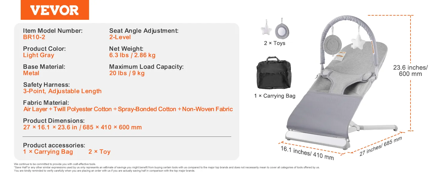 Let your little one enjoy the fun of gentle rocking in a safe and cozy environment. VEVOR baby bouncer features 3-point safety harness, stereoscopic wrapping, 2-level reclining angles and rotatable toy bay to provide secure and comfortable support. Lightweight and foldable, easy to carry on the go.