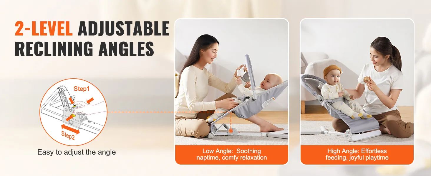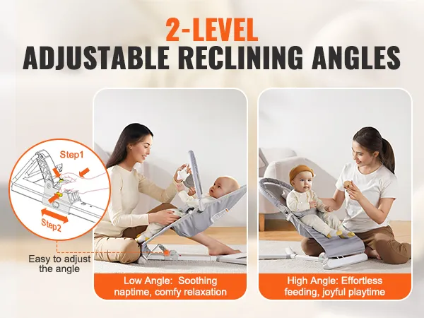 2 Reclining Positions: Our baby bouncer chair features 2-level recline angles, allowing you to find the perfect angle for your baby's comfort and development. Whether it's soothing nap time or engaging playtime, this bouncer seat adapts to your baby's needs, providing optimal support for their head, neck, and spine.