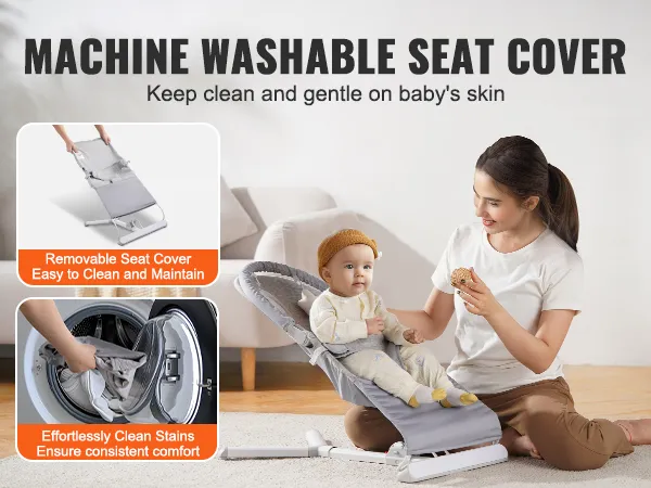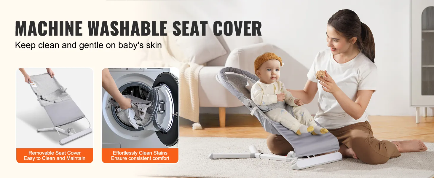 Premium Materials: Our portable bouncer seat for babies is made from high-quality, soft cotton and non-woven fabric, skin-friendly and breathable. The removable, machine-washable cover simplifies cleaning and maintenance, so you can spend more time enjoying precious moments with your little one.