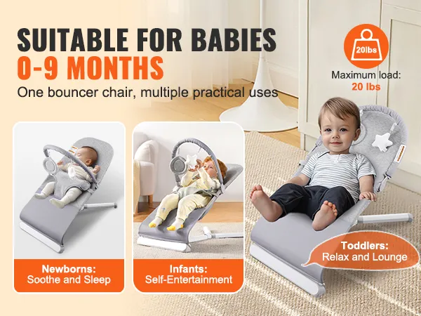 Gentle Bouncing, Happy Babies: Natural bouncing, no plug-in required! VEVOR baby bouncer features 3-point safety harness and stereoscopic wrapping, providing a gentle and secure rocking experience. Soothing bouncing motions imitate moms warm womb, keeping your babies sleep soundly and play happily. (Suitable for 0-9 months babies, Maximum load: 20LBS)
