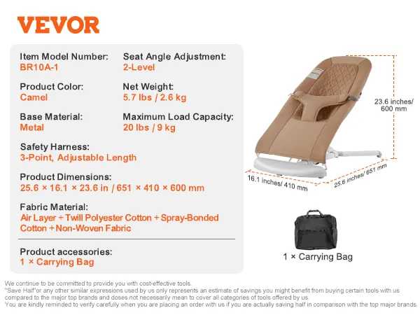 VEVOR Baby Bouncer, wipstoel voor baby's van 0-9 maanden, schommelstoel voor pasgeborenen met 2 ligstanden en 3-puntsgordel, babyschommel met draagtas voor binnen en buiten, 651x410x600mm, kameel