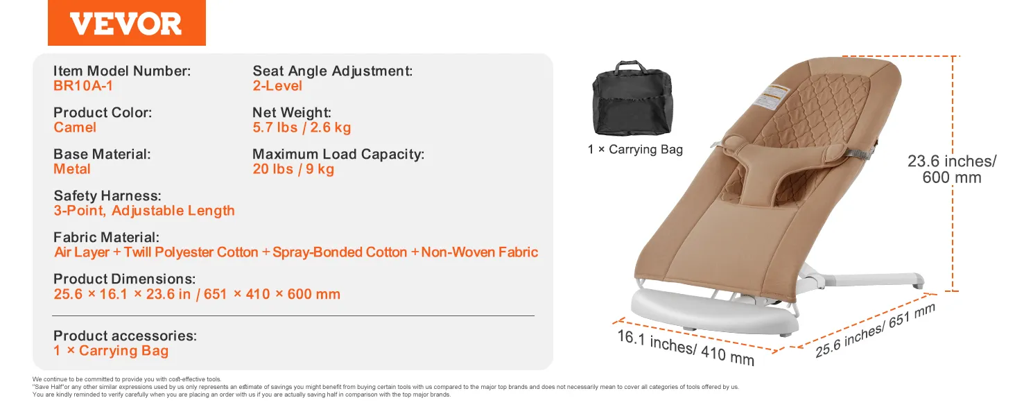 Het VEVOR wipstoeltje is voorzien van een 3-puntsveiligheidsgordel, een stereoscopisch wikkelontwerp en een kantelhoek op 2 niveaus voor veilige en comfortabele ondersteuning. Lichtgewicht en opvouwbaar, waardoor u hem gemakkelijk onderweg kunt meenemen.