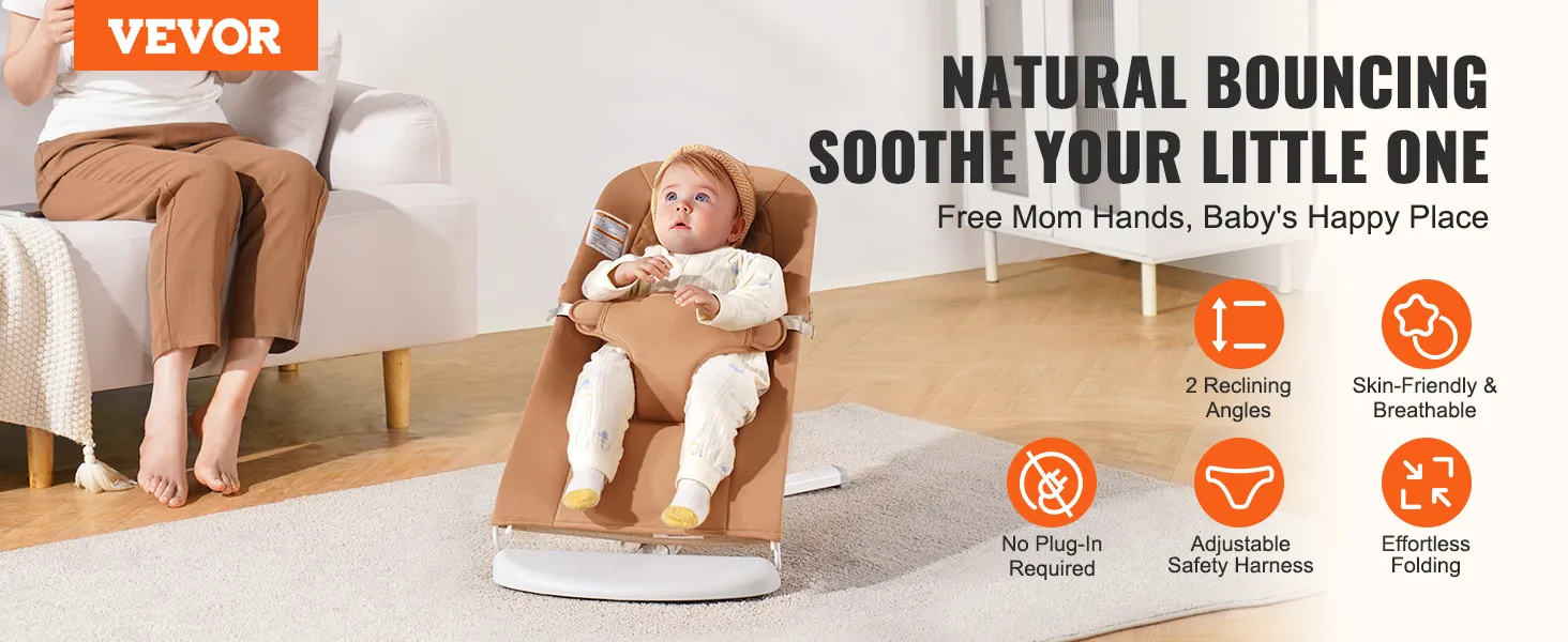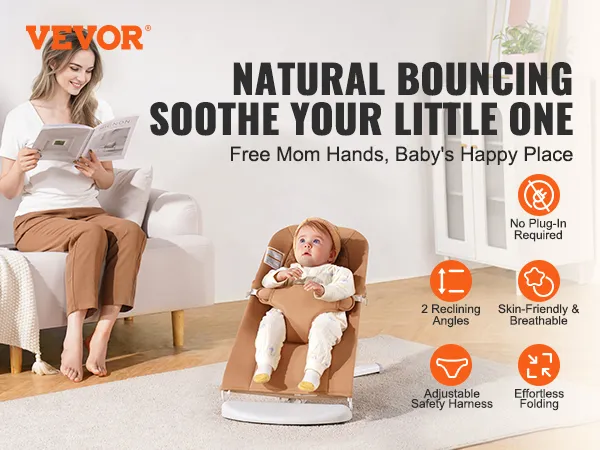 Zacht stuiteren, blije baby's: natuurlijk stuiteren, geen stekker nodig! Het VEVOR wipstoeltje is voorzien van een 3-puntsveiligheidsgordel en een stereoscopische hoes die zorgt voor een zachte en veilige schommelervaring. Kalmerende stuiterende bewegingen bootsen de warme baarmoeder na, zodat uw baby goed slaapt en vrolijk speelt. (Geschikt voor baby's van 0-9 maanden, maximale belasting: 20 lbs / 9 kg)