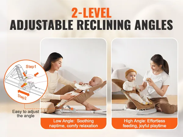 Het baby-schommelzitje heeft twee verstelbare hoeken, zodat hij aan de verschillende behoeften van uw baby kan voldoen, of hij nu speelt of rust. De kanteling van de stoel verstel je eenvoudig.