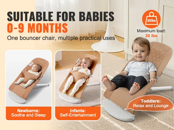 Dit opvouwbare wipstoeltje is geschikt voor baby's van 0 tot 9 maanden en biedt hen een comfortabele plek om te ontspannen en tegelijkertijd hun gezonde groei te bevorderen.