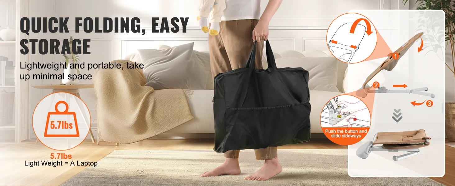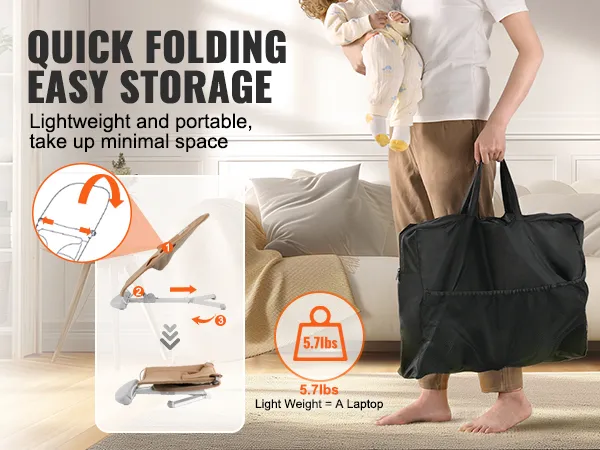 Opvouwbaar en ruimtebesparend: u hoeft het wipstoeltje niet te demonteren - vouw het gewoon op voor eenvoudig opbergen. Dankzij de meegeleverde draagtas neem je de wipstoel gemakkelijk mee naar buiten en heb je overal een knus en comfortabel plekje voor je baby.