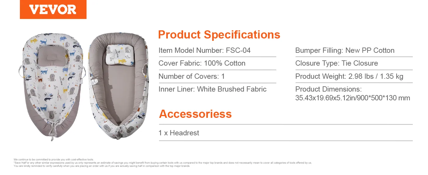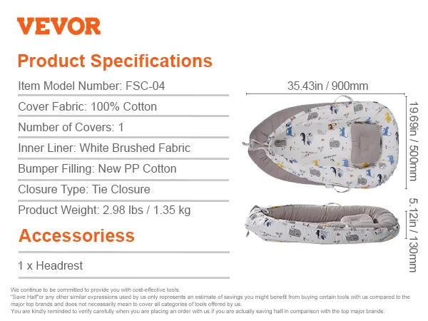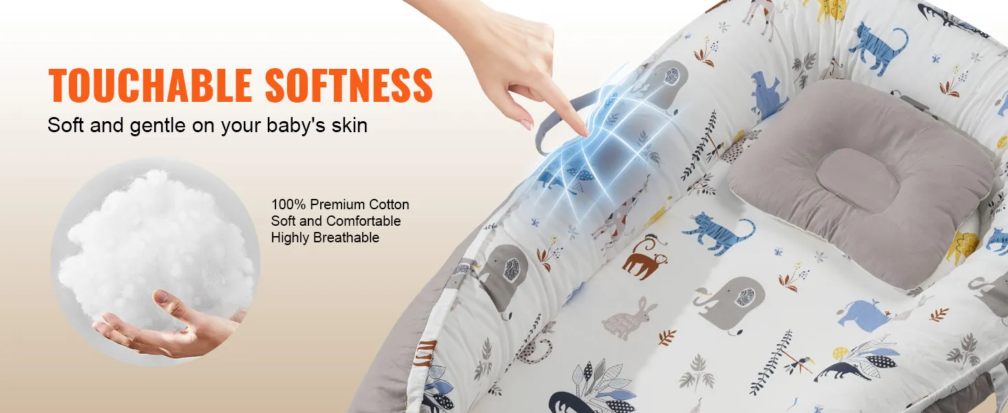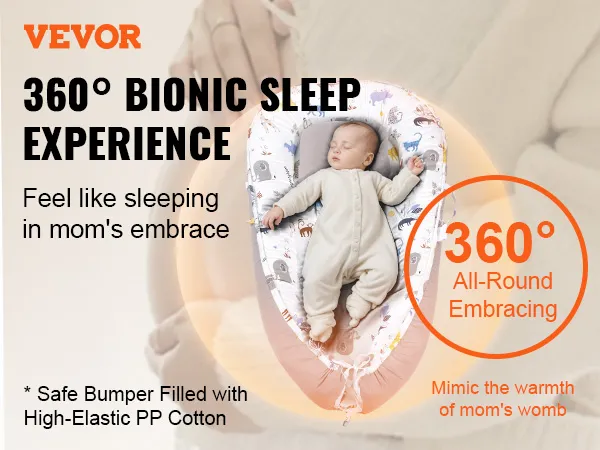 VEVOR baby lounger features a double-sided design with 100% cotton fabric, providing a soft and gentle touch for baby. Its headrest, 360° wrap-around embracing and safe bumpers mimic the warmth and security of mom’s embrace, ensuring your baby enjoys a safe and comfortable sleep experience.