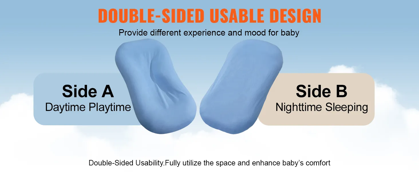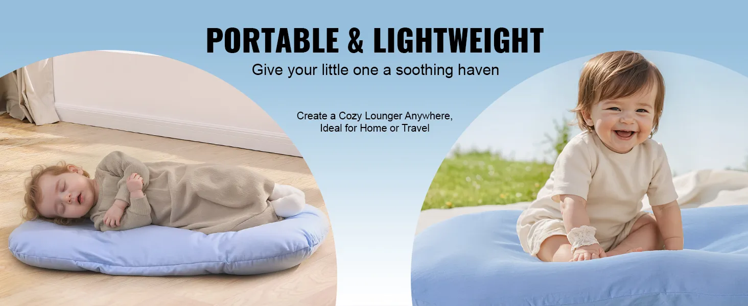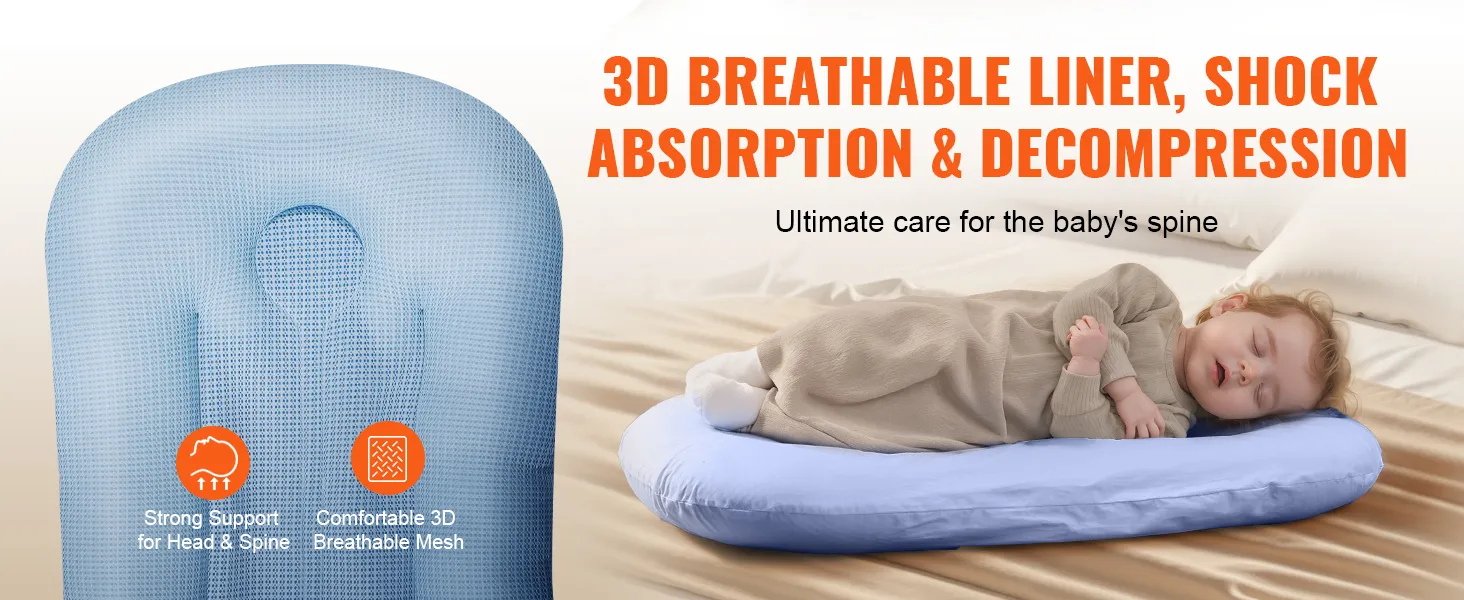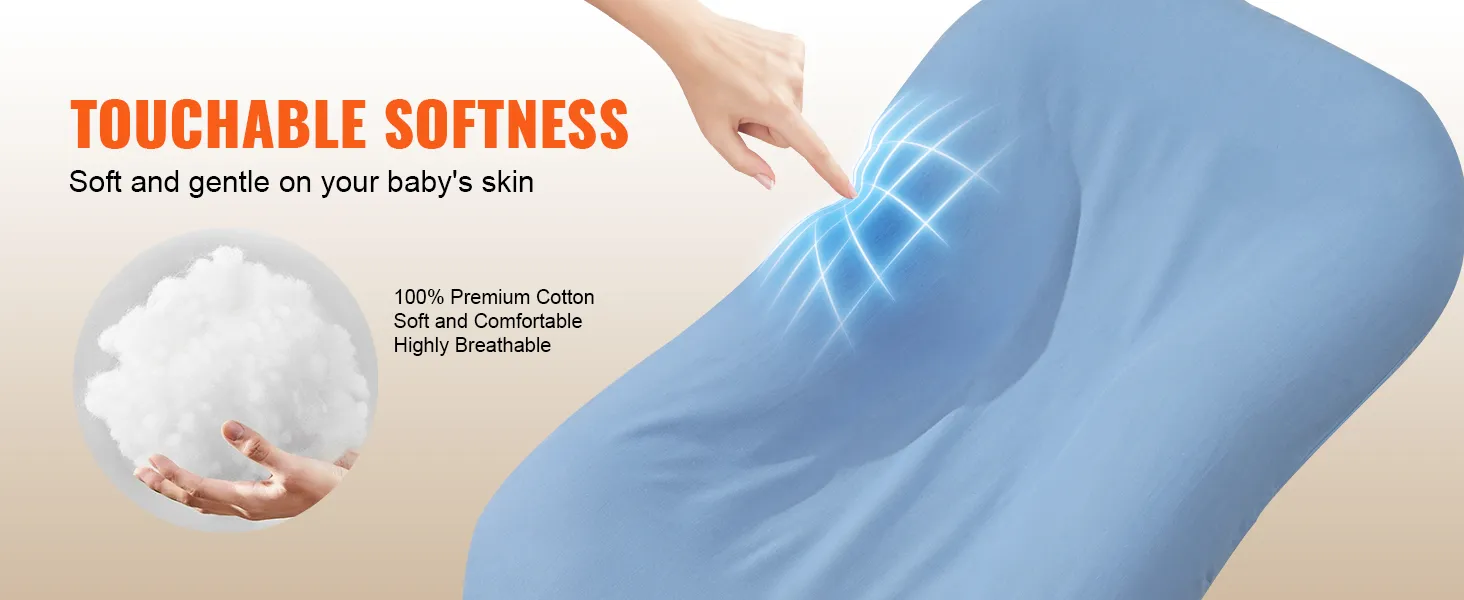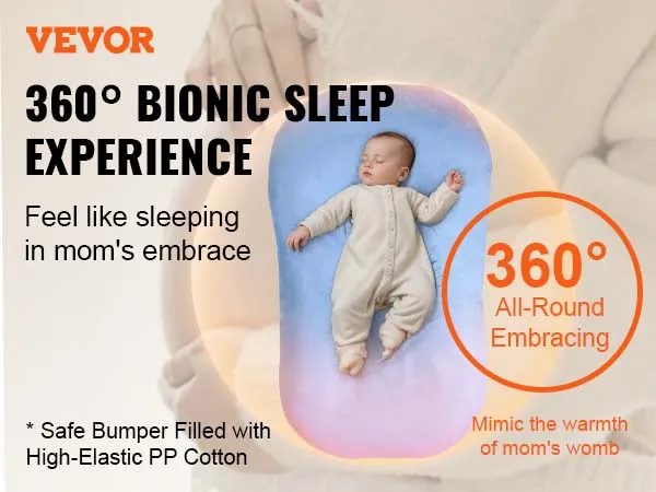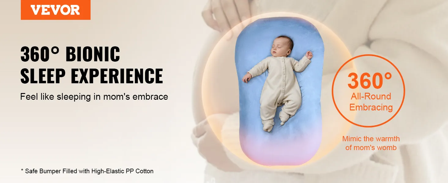 VEVOR baby lounger features a double-sided design with 100% cotton fabric, providing a soft and gentle touch for baby. Its 360° all-round embracing and safe bumpers mimic the warmth and security of mom’s embrace, ensuring your baby enjoys a safe, clean, and comfortable sleep experience.