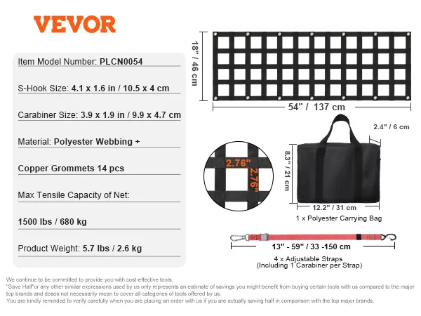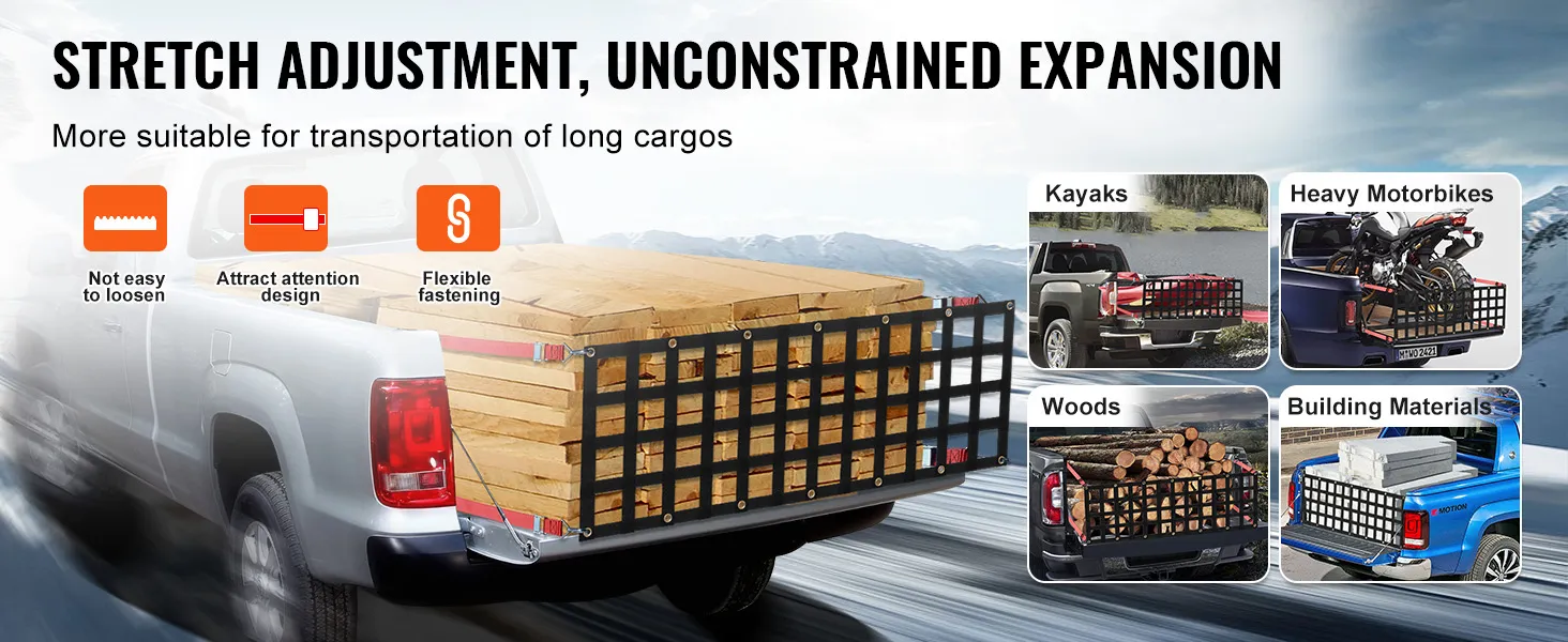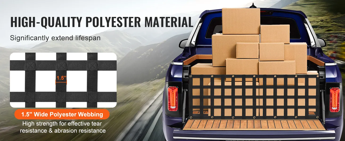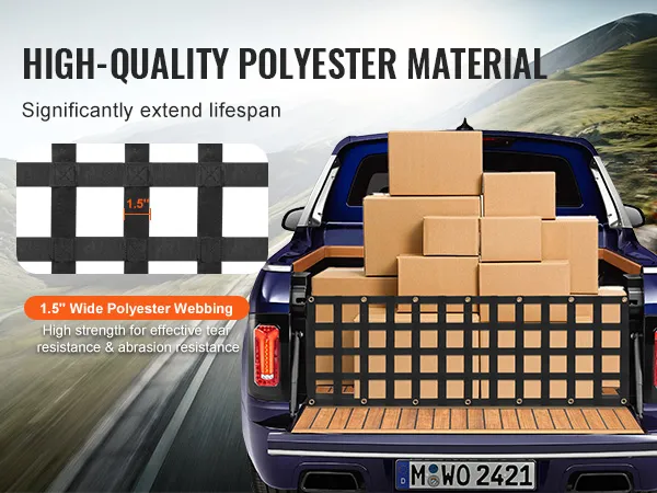 VEVOR tailgate net has a load-bearing capacity of up to 1500 lbs, is wear-resistant and tear-resistant, which is suitable for fixing various extra-long and heavy cargos, so that the transportation of cargos is more secure.
