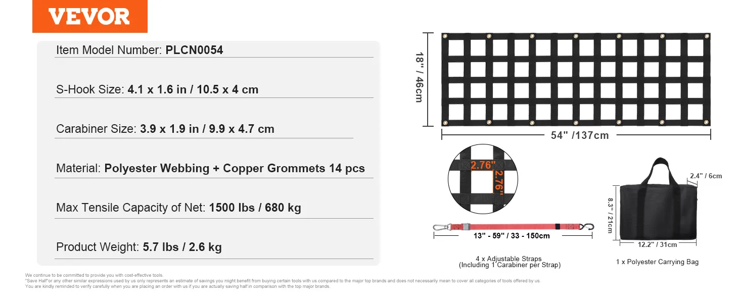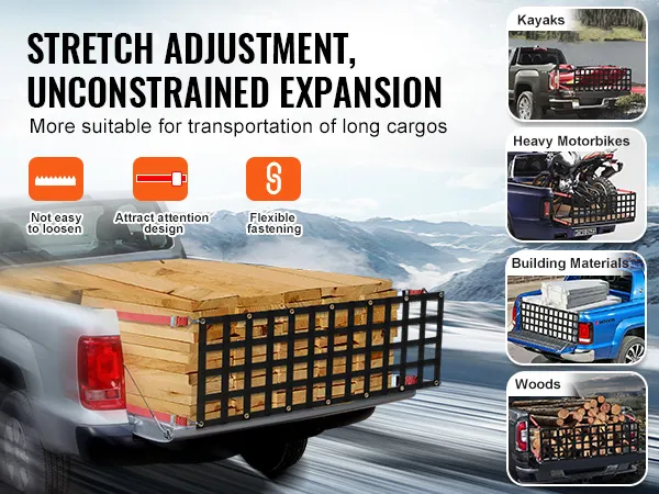 Easy Installation & Disassembly: VEVOR tailgate net for pickup truck bed is equipped with metal buckles and S-hooks on each telescopic strap. You just need to fix the four S-hooks on the vehicle and there are no additional tools required, which saves time and improves efficiency. (Tip: Please make sure you have fixed the anchors or bolts on your truck.)