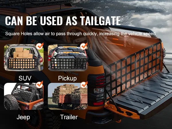 Our tailgate net is suitable for trucks, SUVs, pickups, jeeps and trailers, etc. The mesh design accelerates air flow, which reduces drag and improves fuel efficiency.