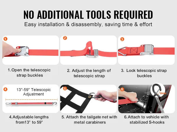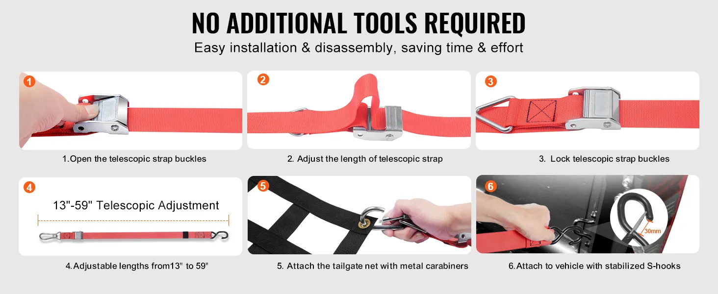 Each telescopic strap comes with a carabiner and S-hook, easy to install and disassemble without tools. Note: Tailgate net requires fixed anchors or bolts to be used.