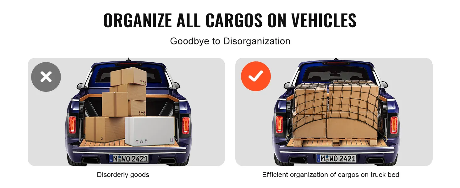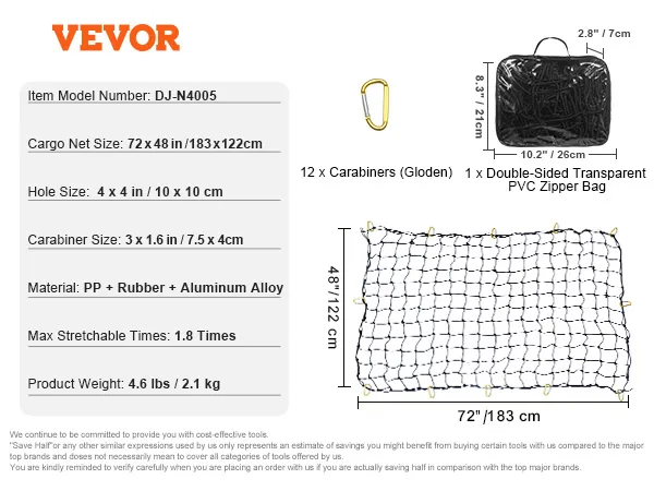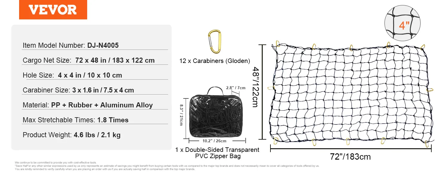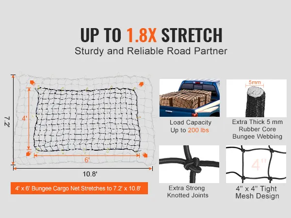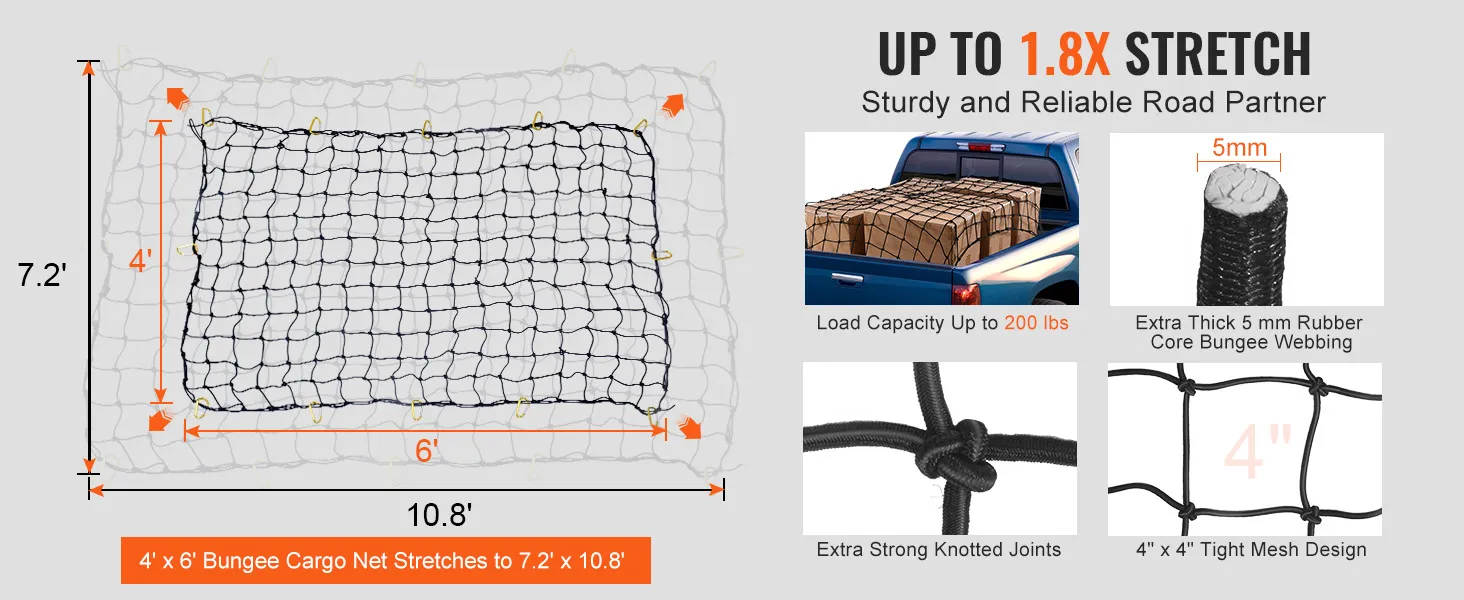 VEVOR bungee cargo net can be stretched from 4' x 6' to 7.2' x 10.8', with a load capacity of up to 200 lbs, providing a more secure and comprehensive transportation fixing solution.