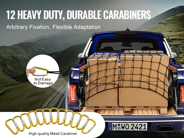 12 Carabiners for Flexible Fixing: Our bungee cargo net is equipped with 12 heavy-duty and durable carabiners for fixing. And multiple fixing points allow you to secure different shapes and sizes of cargos, providing more comprehensive and reliable protection for the cargos. (Tip: Please make sure you have fixed the anchor points or bolts on your truck!)